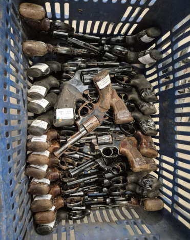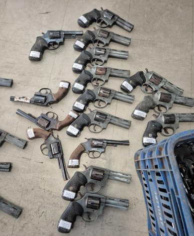 Lote 09: Revólver calibre 38, TAURUS, 5 tiros: AA450852, AA450855, AA450579, AA450680, AA450687, AA450682, AA450746, AA450893, AA450906, AA450691, cada unidade avaliada em R$ 450,00. AVALIAÇÃO TOTAL LOTE 09: R$ 4.500,00 (quatro mil e quinhentos reais). Observação: Conforme Certidão da Sra. Oficiala de Justiça de id 0b8537d, na data da penhora, as armas se encontravam em estado regular a ruim (algumas em péssimo estado), a maioria apresentando ferrugem em seu mecanismo, sendo necessária a troca de peças e manutenção geral. LOCALIZAÇÃO DOS BENS: Avenida Brasil, 4.150, Manoel Honório, Juiz de Fora/MG - Superintendência da Polícia Federal.