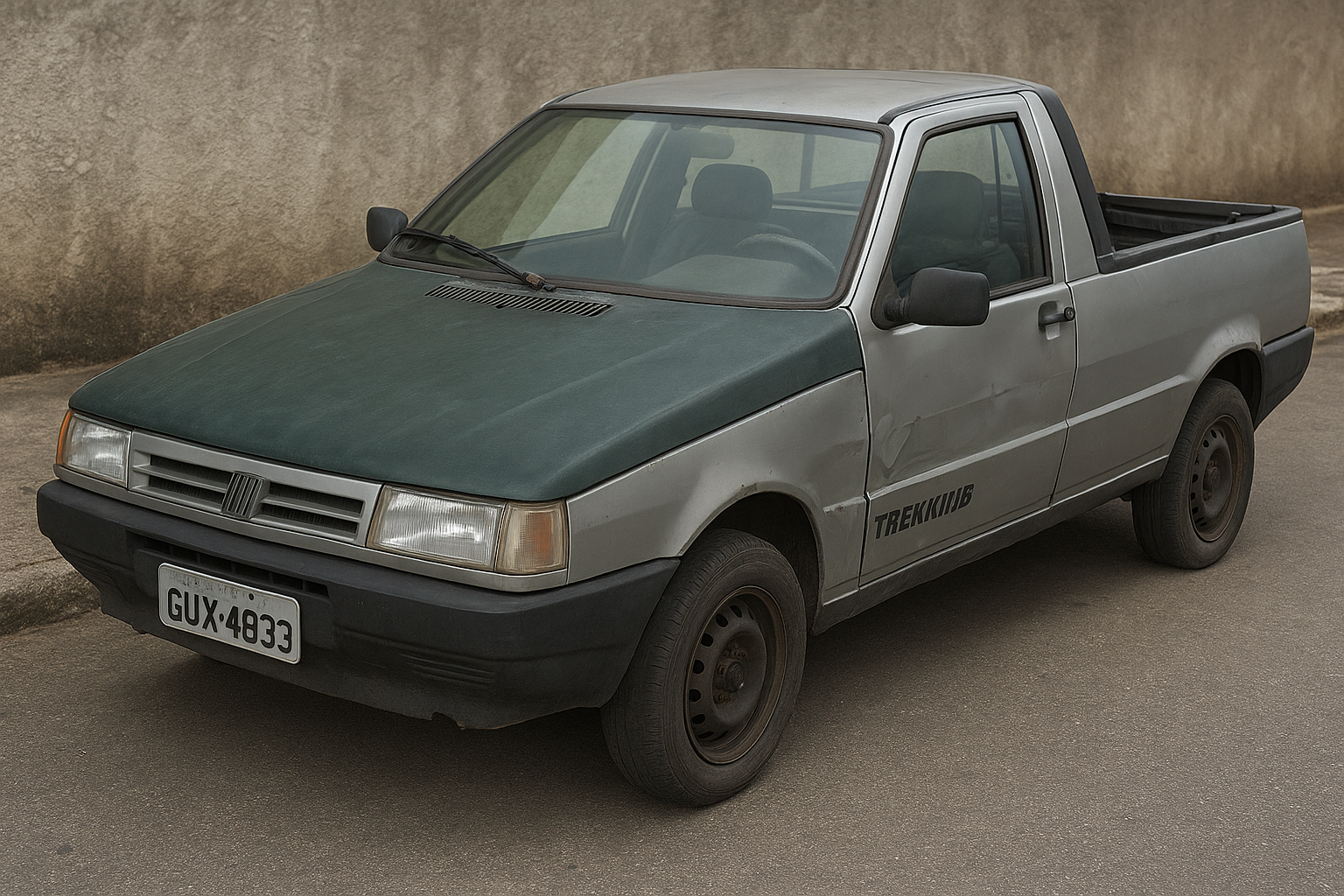 CAMINHONETE FIAT/FIORINO TREKKING, ano de fabricação/ modelo 1997/1997, placa GUX4833, chassi 9BD255384V8526115, renavam: 00676802265, o veículo apresenta avarias na porta do motorista, tampa do capô de cor diferente da do carro e pneus carecas.