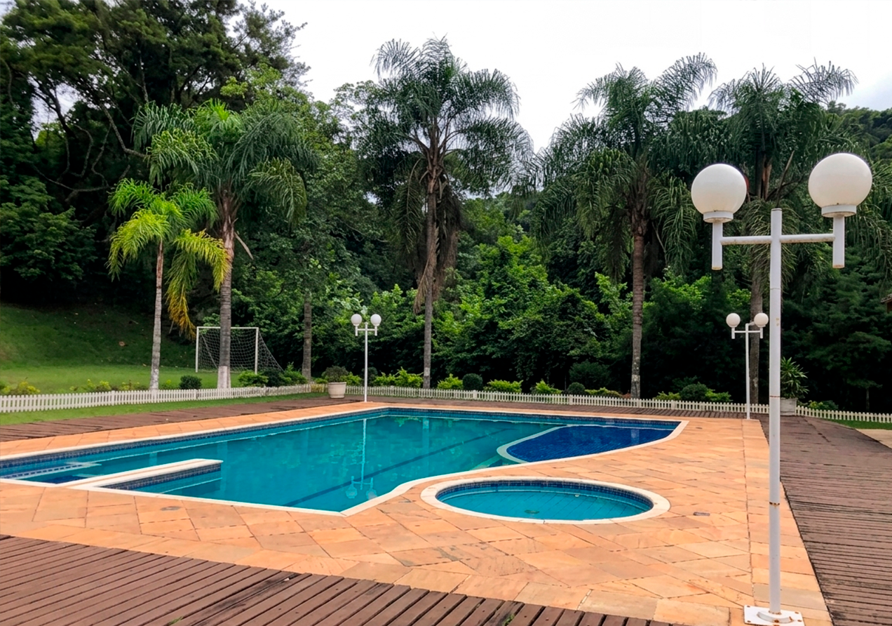 Imóvel com área construída de aprox. 157m², em terreno de aprox. 4.980m², contendo casa principal com 04 quartos, sala de jantar, sala de estar, cozinha, 02 banheiros, área de serviço, varanda, piscina, churrasqueira, vestiário, sauna e banheiro; e casa de caseiro com 03 quartos, depósito, área de serviço, cozinha, sala e banheiro.