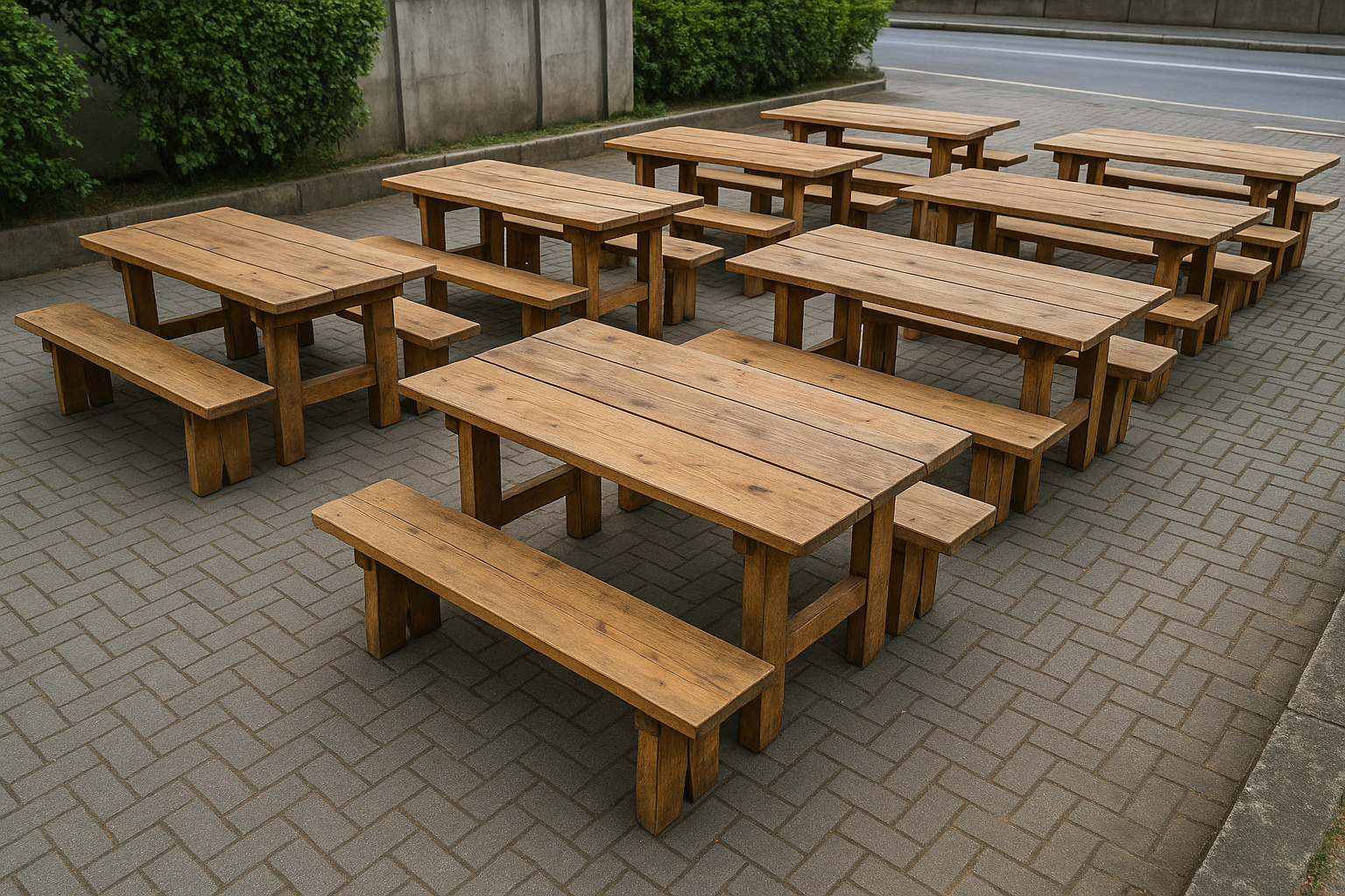 09 mesas rústicas de madeira de reflorestamento (pinus e eucalipto), medindo 1,50m x 0,78m cada, acompanhadas de 02 bancos por mesa.